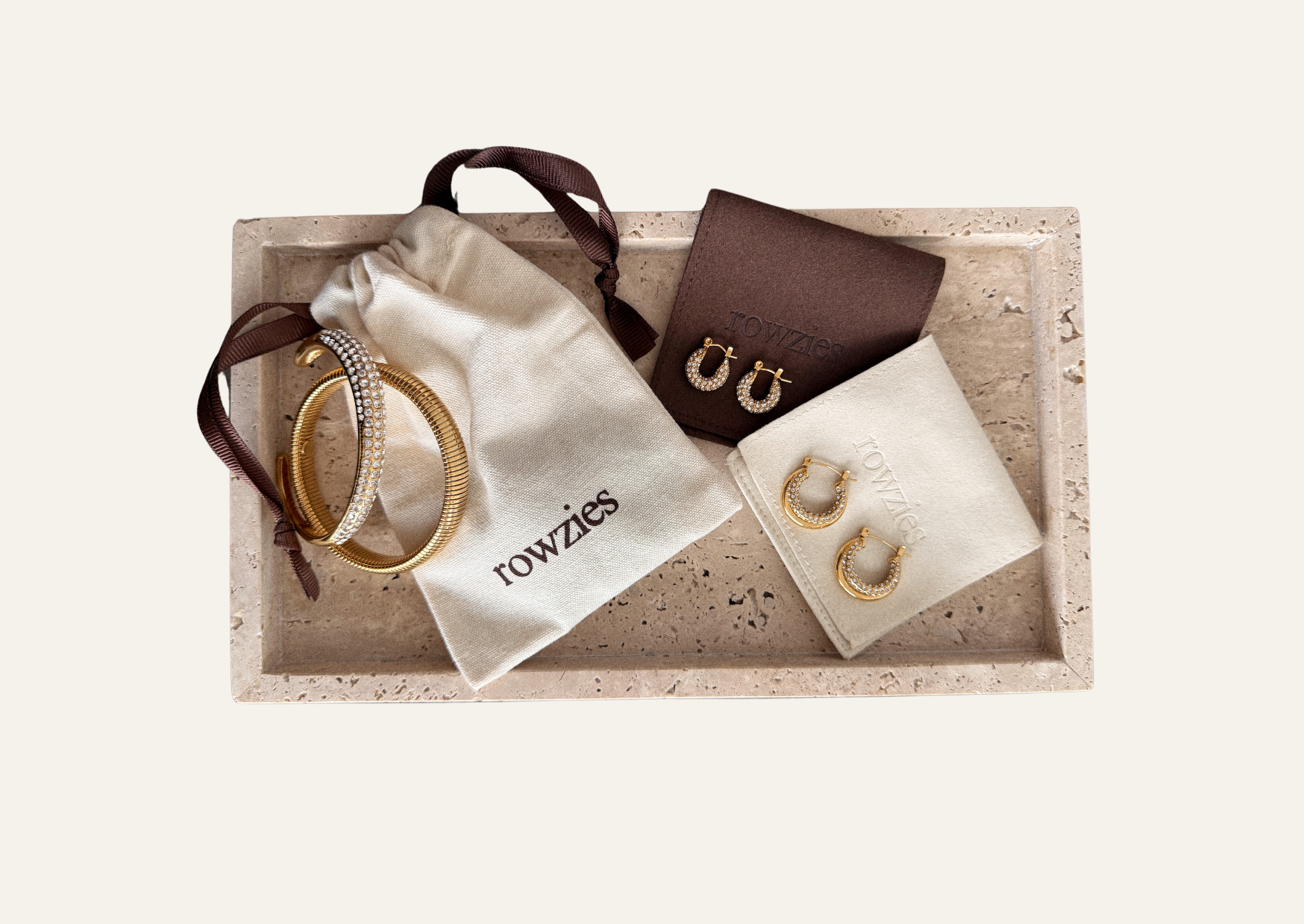 That’s why each Rowzies piece comes in a beautifully designed pouch that not only protects your treasures but also makes storage easy—whether at home or on the go. Perfect for keeping your pieces safe and organized while adding a touch of elegance to your daily routine or travels.
