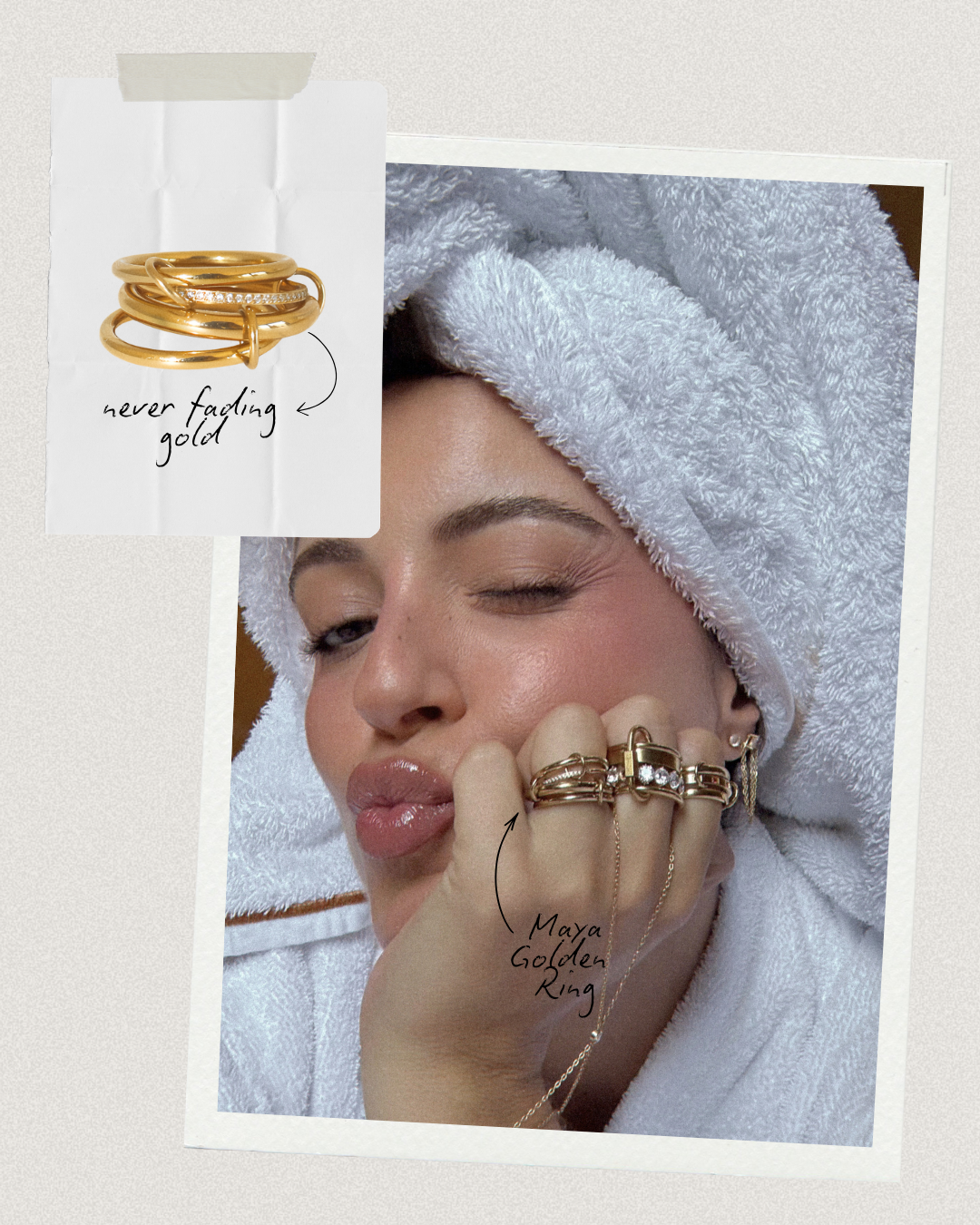 Four-in-one statement – The look of four rings, seamlessly connected by a delicate hoop for an effortless stacked effect.